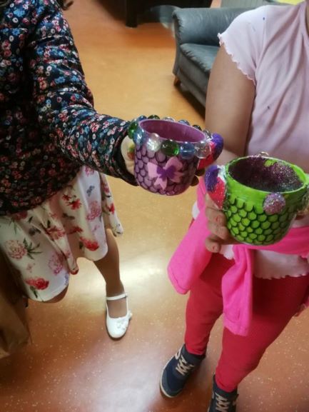 Dabei wurde gezeichnet, skizziert und ausgemalt. Außerdem wurden Stiftebehälter aus Glas mit Schuppenmuster und Muscheln verziert. Den Höhepunkt für die Mädchen stellte aber die Herstellung des Meerjungfrauen – Slimes dar. Dieser Slime wurde nach Belieben mit Lebensmittelfarbe einfärben und mit Glitzer verschönern. Und zum Aufbewahren wurde von jedem Mädchen ein Einmachglas kreativ gestaltet und verziert.